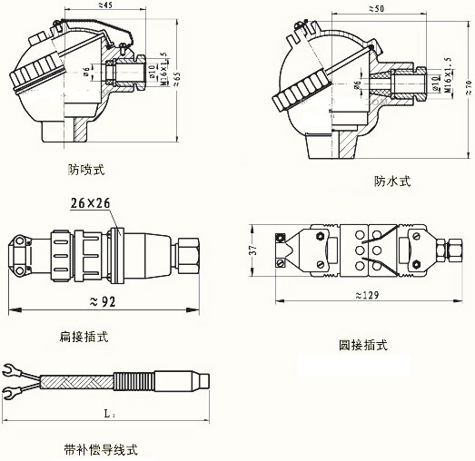 分度代號溫度范圍℃精度等級安裝固定裝置WZPK-133Pt100-200-+500A級或b級無固定裝置wzpk-134 wzpk-135 wzpk-136 wzpk-138 wzpk2- 135 wzpk2- 136 wzpk2- 138 wzpk-233固定螺紋件wzpk-134 k-238 wzpk2- 234 wzpk2- 235 wzpk2- 236 wzpk-238 wzpk-333可動鎖緊螺釘wzpk-335 wzpk-336 wzpk2- 335 wzpk2- 336 wzpk2- 338 wzpk-433固定鎖緊凸緣wzpk wzpk-438 wzpk2- 435 wzpk2- 436 wzpk2- 438 wzpk-533可動咬合凸緣wzpk-534 wzpk-535 wzpk-536 wzpk-538 wzpk2- 534 wzpk2- 535 wzpk2- 536 wzpk2- 5382 )防噴流式
